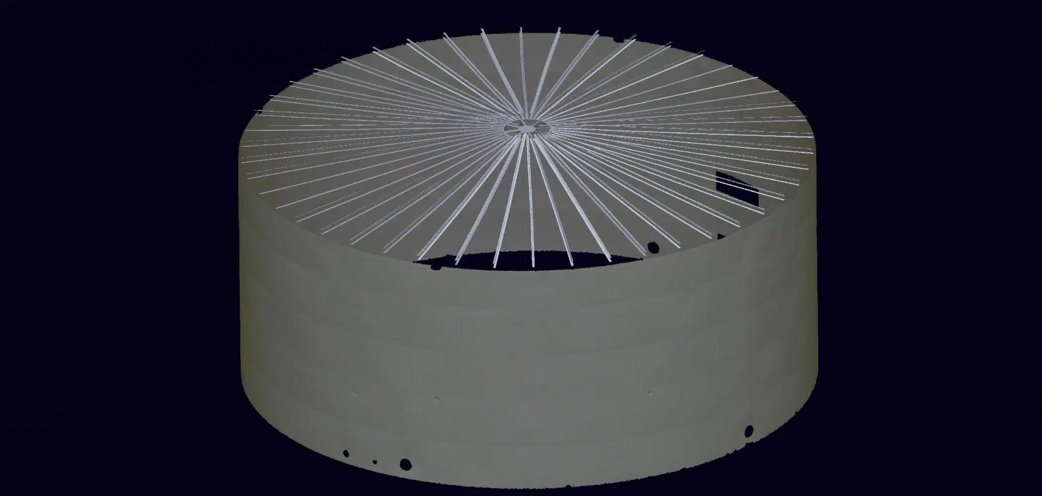 But du relevé : auscultation de cuves permettant de mettre en évidence des déformations hors tolérance. Un modèle maillé a également été produit afin de pouvoir l’intégrer dans un logiciel de calcul de structure (calcul effectué par un BE)
